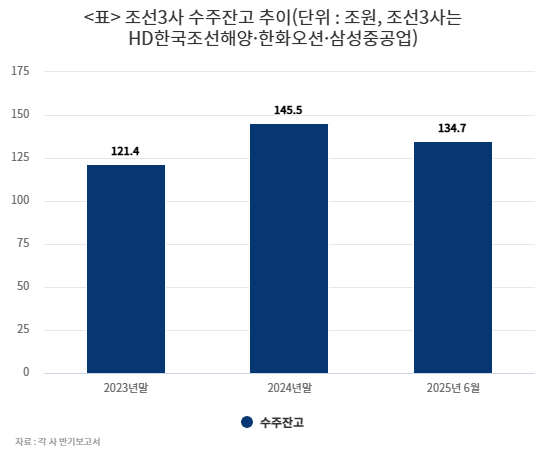 국내 조선사들은 지난 2년간 글로벌 선박 시장 호황에 힘입어 수주량을 대폭 늘렸다. 그 결과 조선 3사 수주잔고는 2023년 말(121조3515억원)부터 지난해까지 19.9% 증가했다.