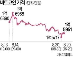 20일 국내 최대 암호화폐거래소 업비트에 따르면 비트코인은 이날 오후 2시30분 1억5920만원에 거래됐다. 최고가를 기록한 지난 14일(1억6968만원)과 비교해 약 6.2% 하락했다. 미국 최대 암호화폐거래소인 코인베이스에선 14일 12만4000달러를 넘긴 비트코인 가격이 이날 11만3600달러 안팎으로 8% 넘게 떨어졌다.