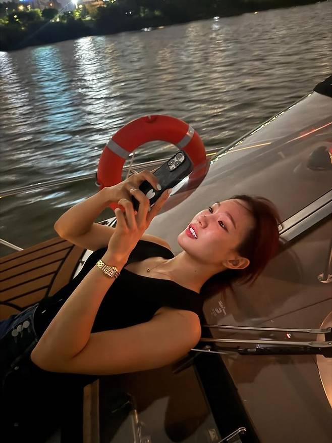 유현주가 보트 위에 누워 휴대폰을 바라보며 여유를 즐기는 모습이 담겼다. 무심하게 흘러내린 머리와 편안한 표정이 매혹적인 분위기를 자아낸다.