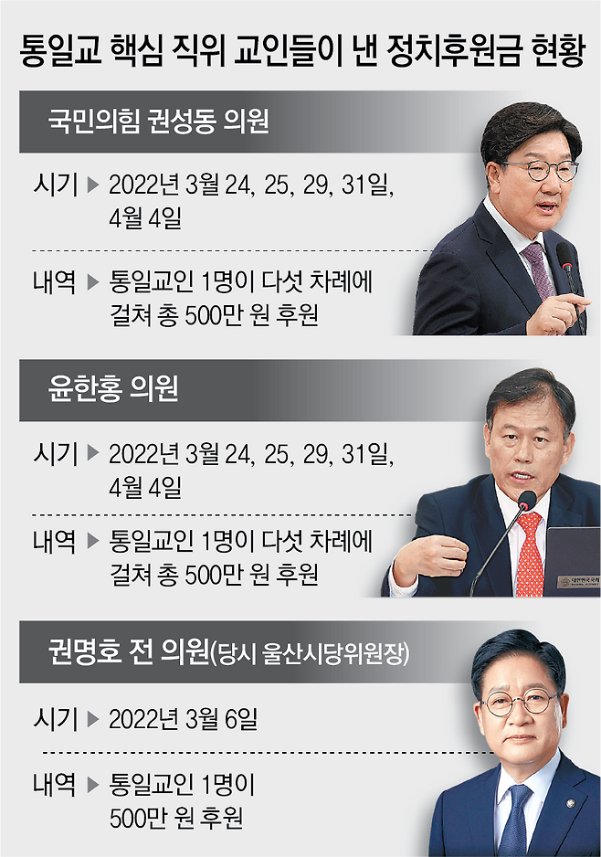 20일 동아일보가 확인한 국회의원 정치후원금 고액후원자 명단에 따르면 2022년 3∼4월 통일교 교인 3명은 당시 윤핵관으로 불렸던 국민의힘 권성동, 윤한홍 의원, 장제원 전 의원에게 각각 법정 최고 한도인 500만 원을 후원했다. 당시 서울시당위원장이었던 박성중 전 의원은 교인 3명으로부터 각각 500만 원씩 총 1500만 원을, 울산시당위원장이던 권명호 전 의원은 교인 1명에게 500만 원을 받았다. 후원자들은 대부분 통일교에서 지구장, 교구장 등 지역 책임자급 직책을 맡았던 인사들로 파악됐다.