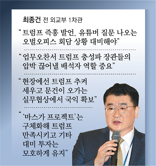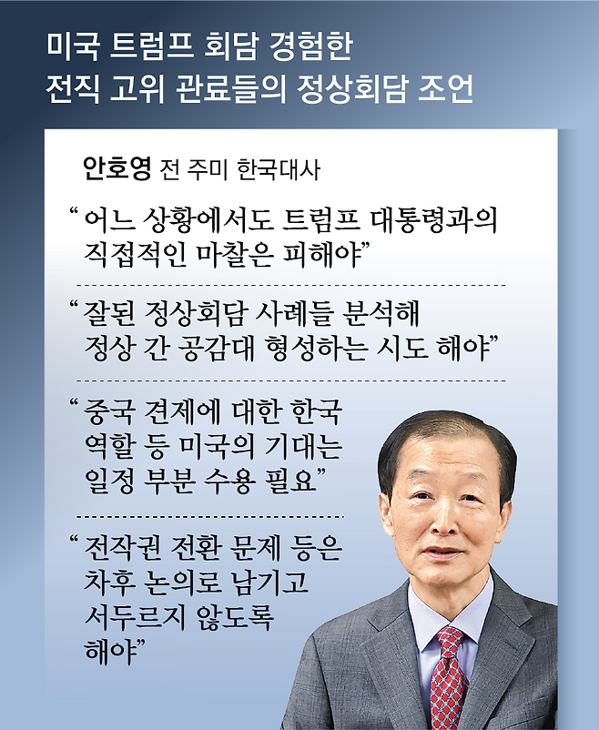 트럼프 대통령과의 정상회담에 참여한 경험이 있는 전직 고위 당국자들은 “어떤 변수에도 대응할 수 있는 상황 관리가 필요하다”며 “‘마스가(MASGA·미국 조선업을 다시 위대하게) 프로젝트’ 등 한국이 강점을 가진 분야에선 확실한 성과를 안겨주면서 충돌을 피하는 것이 중요하다”고 입을 모았다.
