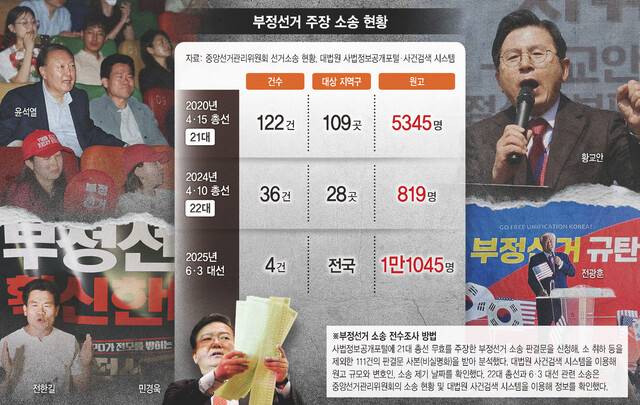 중앙선관위는 “더는 소모적 의혹 제기가 없어지길 기대한다”고 했지만 공염불이었다. 2020년에 이어 2024년 22대 총선에서도 국민의힘이 기록적 참패를 당하자, 기다렸다는 듯 부정선거를 주장하는 소송 36건(재심 청구 1건 포함)이 제기됐다. 총선 9일 만에 ‘여론조사 결과와 다르다’ 등의 이유로 비례대표 선거 결과를 무효로 해달라는 소송이 제기됐다. 전광훈 목사가 이끄는 자유통일당 후보로 6·3 대선에 출마했던 구주와 변호사가 소송을 대리했다. 소송 제기 기한이 임박한 5월9일에는 하루 23건의 소송이 쏟아졌다. ‘사전투표와 본투표 득표율에 차이가 있다’ ‘투표수·투표율·선거인수가 조작됐다’ 등 이미 대법원에서 기각된 주장을 지역구·원고만 바꿔 제기한 것이다. 대법원이 부정선거를 은폐했다고 주장하는 책 ‘스톱 더 스틸’을 쓴 박주현·윤용진 변호사 등이 소송 대리인이다.