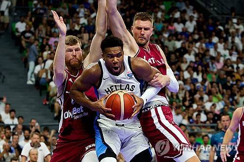 epa12313060 Greece's Giannis Antetokounmpo (C) in action against Latvia's Davis Bertans (L) during the Acropolis tournament friendly basketball match between Greece and Latvia, in Athens, Greece, 20 August 2025. EPA/GEORGIA PANAGOPOULOU