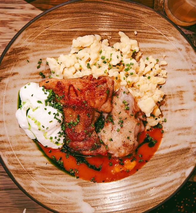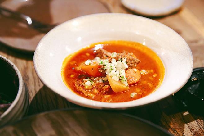 테이스팅 메뉴도 준비돼 있다. 굴라쉬(소고기 감자 파프리카 수프), 치킨 파프리카쉬(구운 닭+파프리카 소스+요거트), 헝가리 돼지 품종인 만갈리차(MANGALICA) 목살 스테이크, 코티지 치즈 덤플링 등 헝가리 감성이 가득 담긴 식사가 가능하다.