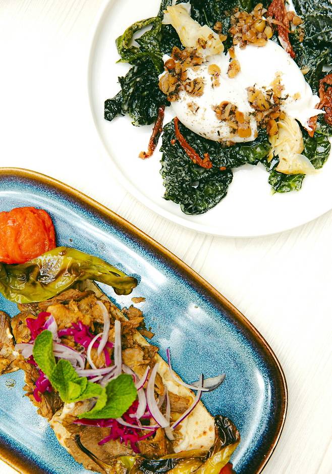 음식은 중동과 지중해의 조합으로, 중동의 향신료와 지중해의 건강한 식단이 만났다. 샥슈카, 후무스, 차지키(그리스식 요거트 소스)+피타(중동 지역에서 흔히 먹는 납작한 빵), 다양한 작은 요리를 나눠 먹는 스타일의 메제(Mezze), 농어 스테이크, 양고기 플래터 등이 있다.