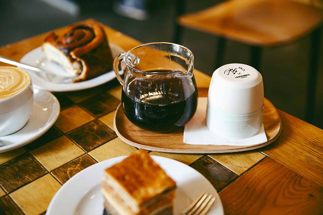 필터 커피는 배치 브루(Batch Brew, 한 번에 여러 잔을 추출하는 브루잉 기법), 칼리타(커피 용품 브랜드이며, 해당 브랜드의 드리퍼를 활용한 핸드드립, 원두 선택 가능) 2종류가 준비돼 있고, 에스프레소 기반 음료(코르타도·카푸치노·플랫화이트·라테 등)도 있다.