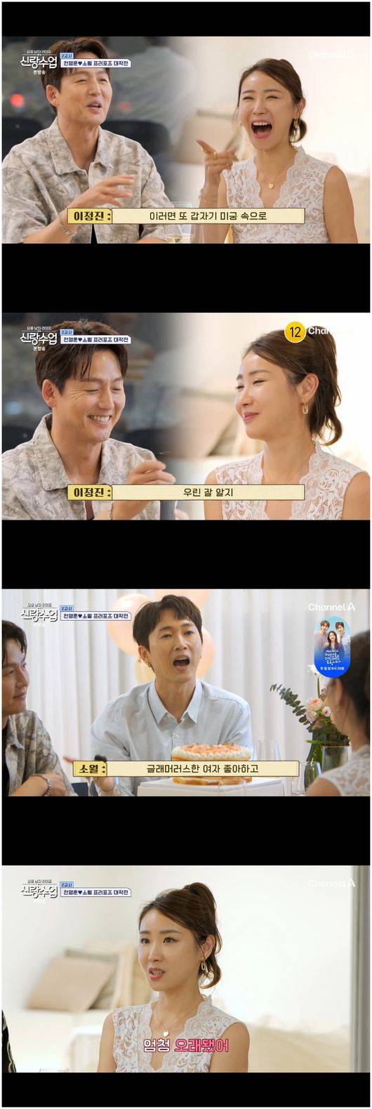 20일 방영한 채널A 예능 '요즘 남자 라이프 신랑수업'(이하 '신랑수업')에서는 김일우와 박선영이 속을 터놓는 심리 검사 데이트, 그리고 천명훈과 소월의 만난 지 55일 기념 데이트가 그려졌다.