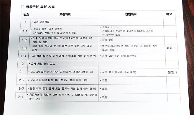 | ▲ 최근 영동군이 A씨가 기증한 조경수와 조경석에 관련해 이광희 국회의원에 제출한 자료 (사진제공=이광희 국회의원실) |
