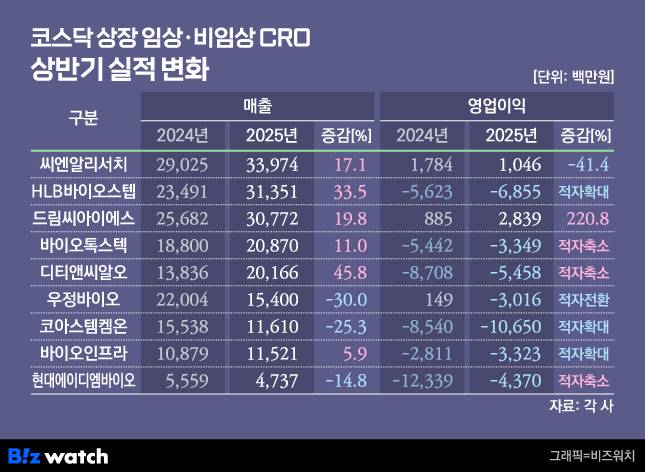 임상 CRO는 글로벌 시장 확대 성과를 거두며 존재감을 키웠지만, 비임상 CRO는 '제 살 깎기' 경쟁 속에서 적자 늪에 빠졌다. CRO는 신약 개발 과정에서 임상·비임상 시험을 위탁 수행하는 전문 연구기관으로 제약바이오 기업들의 연구 효율성을 높이는 핵심 파트너다.
