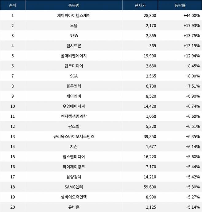 이밖에도 엔지켐생명과학(183490) ▲6.60%, 팜스빌(318010) ▲6.51%, 큐리옥스바이오시스템즈(445680) ▲6.35%, 지슨(446840) ▲6.14%, 칩스앤미디어(094360) ▲5.60%, 와이제이링크(209640) ▲5.44%, 삼양컴텍(484590) ▲5.42%, SAMG엔터(419530) ▲5.30%, 셀바이오휴먼텍(318160) ▲5.27%, 유비온(084440) ▲5.14% 등을 기록하며 시장에서 활발히 거래되고 있다.