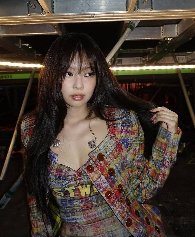 사진 속 제니는 체크 패턴 셋업을 착용해 시선을 사로잡았다. 클래식한 자켓에 몸매 라인을 살린 보디슈트를 매치해 무대 위 아이돌다운 카리스마를 드러냈다. 그는 자연스럽게 머리카락을 넘기며 무심한 듯 시크한 분위기를 연출했다.