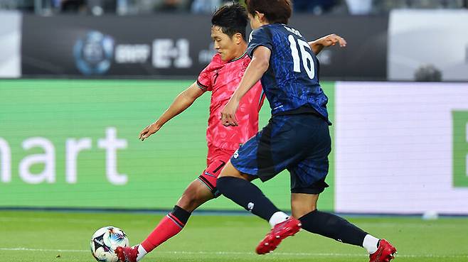 ▲ 지난달 15일 2025년 동아시아축구연맹(EAFF) E-1 챔피언십(동아시안컵) 남자부 최종 3차전 한국과 일본의 경기에서 한국 나상호가 슈팅하고 있다.