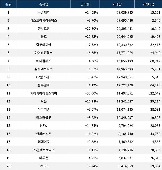 한편 거래량 상위 20위권 종목들은 제이피아이헬스케어(0010V0) ▲30.00%, 노을(376930) ▲20.38%, 우리기술(032820) ▲3.57%, 미스터블루(207760) ▲3.88%, NEW(160550) ▲14.74%, 한라캐스트(125490) ▼11.82%, 썸에이지(208640) ▲0.33%, PS일렉트로닉스(332570) ▲1.11%, 미투온(201490) ▼4.25%, iMBC(052220) ▲2.74% 등의 성적을 기록했다.
