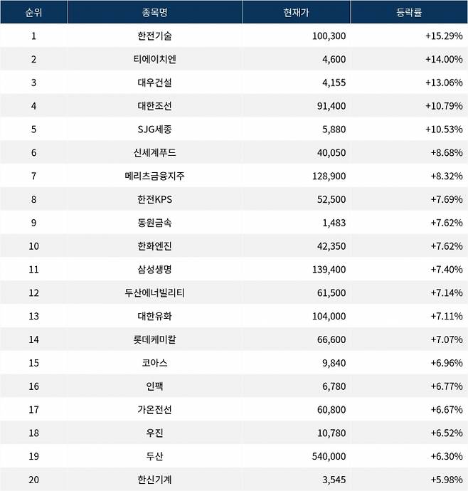 6위 신세계푸드(031440)는 종가 40,050원으로 8.68% 상승 마감했다. 7위 메리츠금융지주(138040)는 종가 128,900원으로 8.32% 상승 마감했다. 8위 한전KPS(051600)는 종가 52,500원으로 7.69% 상승 마감했다. 9위 동원금속(018500)은 종가 1,483원으로 7.62% 상승 마감했다. 10위 한화엔진(082740)은 종가 42,350원으로 7.62% 상승 마감했다.