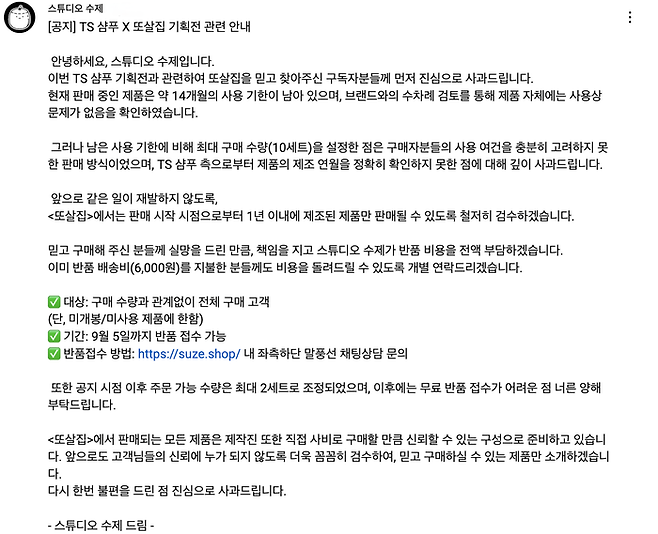 [스포츠서울 | 최승섭기자] 유튜브 채널 ‘스튜디오 수제’의 인기 콘텐츠 ‘또간집’ 속 협업 기획전 ‘또살집’이 TS샴푸 판매 과정에서 촉발된 유통기한 논란에 대해 공식 사과했다.