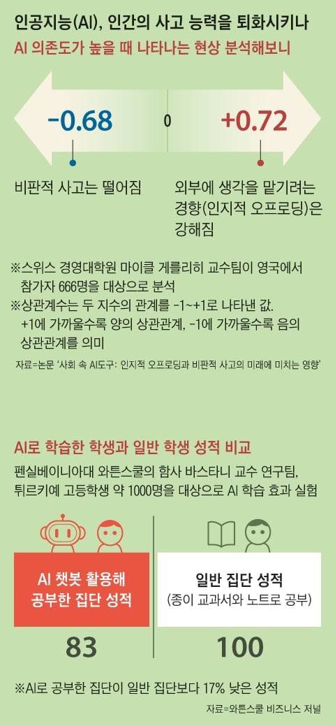 이 같은 우려는 실증적 연구를 통해서도 입증되고 있다. 스위스 경영대학원의 마이클 게를리히 교수 연구팀이 지난 1월 학술지 ‘소사이어티즈(Societies)’에 발표한 논문에 따르면 챗GPT와 같은 AI 도구를 일상적으로 사용하는 이들일수록 비판적 사고 능력은 현저히 낮은 것으로 조사됐다. 연구팀은 영국에서 모집한 666명을 대상으로 AI 의존도에 따른 사고 능력을 측정했다. 그 결과, AI 의존도와 비판적 사고의 상관계수는 -0.68로, AI 의존도가 클수록 비판적 사고는 떨어지는 경향이 뚜렷했다. 또한 AI 의존도가 높을수록 ‘인지적 오프로딩(cognitive offloading)’ 경향은 강하게 나타났다. 인지적 오프로딩이란 기억하거나 계산, 판단하는 일 등을 스마트폰 등 외부 도구에 맡기려는 경향을 뜻한다. 그런데 AI 의존도가 높을수록 이 인지적 오프로딩 경향도 커진 것(상관계수 +0.72)으로 분석됐다. 상관계수란 두 지수 사이의 관계의 정도를 -1에서 1 사이 수치로 나타낸 값으로 +1에 가까울수록 양의 상관관계, -1에 가까울수록 음의 상관관계가 커진다는 의미다.