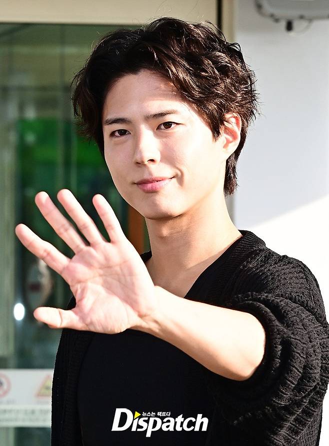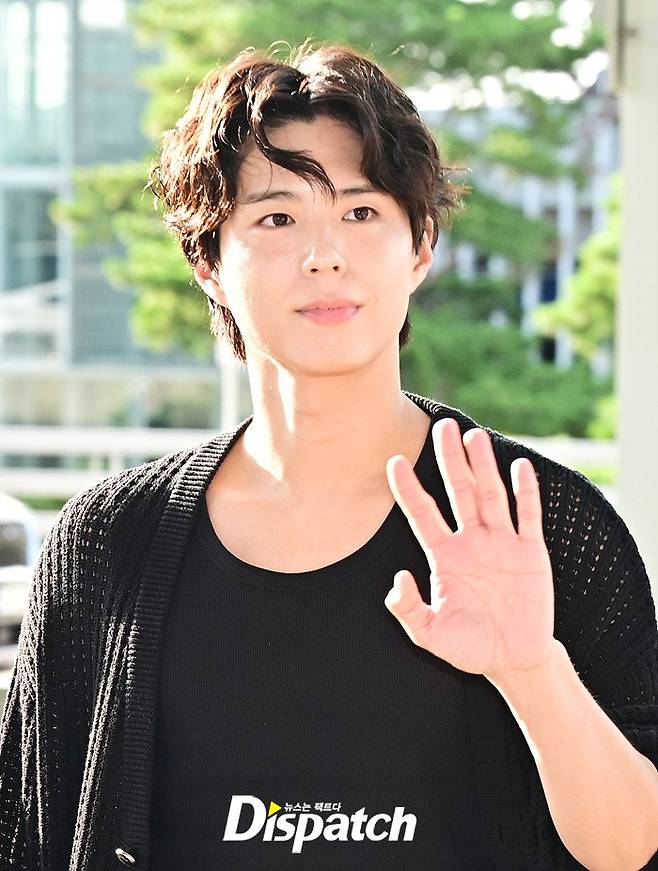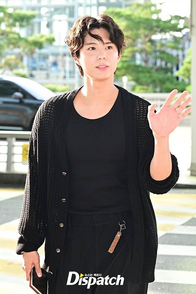 박보검은 올블랙 스타일로 시크한 매력을 뽐냈다. 공항에 모인 팬들을 위해 환한 미소로 화답했다.