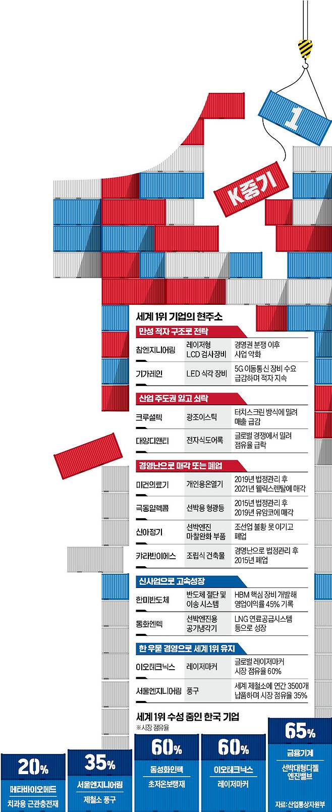 크루셜텍 사례는 세계 최고 수준의 기업도 기술 패러다임 변화와 중국의 추격에 대응하는 게 얼마나 어려운지를 보여준다. 중소벤처기업부 등에 따르면 2013년 기준으로 분야별 세계 1위에 오른 한국 중소·벤처기업은 63곳이었다. 세계 5위 안에 들면서 점유율 5% 이상을 차지한 한국의 ‘세계일류상품’은 2001년 55개에서 2024년 609개로 급증했다.
