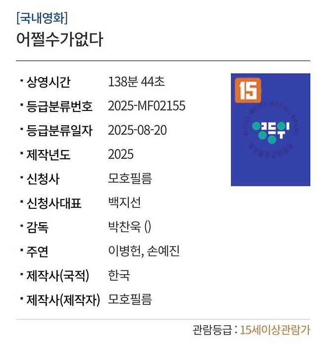 박찬욱 감독의 신작 '어쩔수가없다'가 15세 이상 관람가 등급을 받았다.