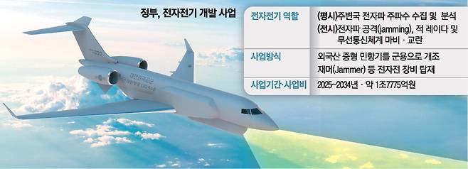 정부 주도로 진행되는 '전자전기 체계개발사업'에 대한항공·LIG넥스원 컨소시엄과 KAI(한국항공우주산업)·한화시스템 컨소시엄이 각각 도전한다. 이번 사업은 중형 민항기를 군용으로 개조하고 전자전기 임무 장비를 탑재하는 방식으로 개발이 진행된다. 중형 여객기인 캐나다 봉바르디에의 G6500을 전자전기 기체로 활용하고 여기에 재머(Jammer) 등 전자파 교란 장비를 탑재하는 방식이다.