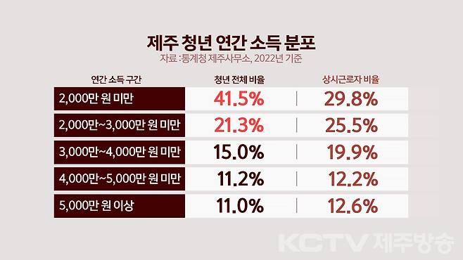 제주 청년의 60% 이상이 연간 소득 3,000만 원 미만이며 10명 중 4명은 2,000만 원도 벌지 못하는 것으로 나타났습니다.
