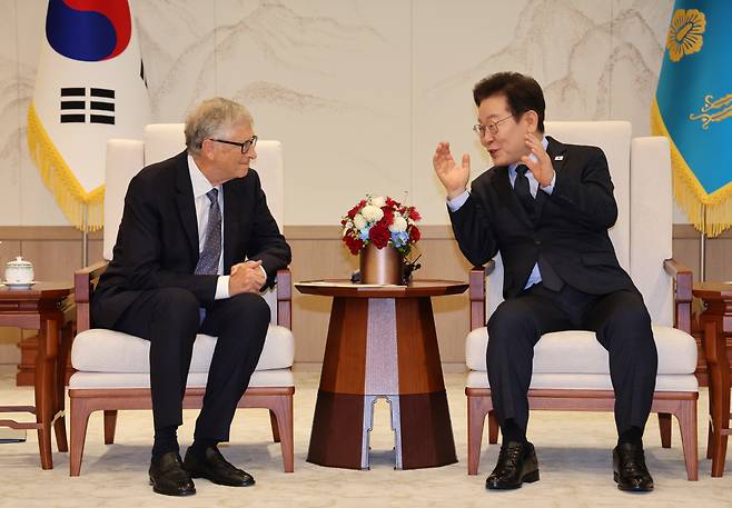 이재명 대통령이 21일 서울 용산 대통령실 청사에서 마이크로소프트 창업자인 빌 게이츠 게이츠재단 이사장과 이야기하고 있다. 게이츠 이사장이 다가오는 한·미 정상회담을 언급하며 “트럼프 대통령과 대화를 잘 나누시라”고 덕담하자 이 대통령은 “슬기롭게 잘 대화하겠다”고 화답했다.