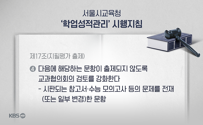 서울시교육청의 '학업성적관리 지침'에 따르면 '시판되는 참고서나 수능 모의고사 등의 문제를 전재(또는 일부 변경)한 문항'을 출제하지 않을 것을 권고하고 있습니다.