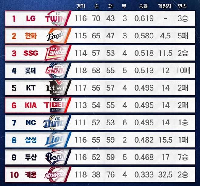 3위 SSG 랜더스를 필두로 롯데 자이언츠, KT 위즈, KIA 타이거즈, NC 다이노스는 물론 하위권의 삼성 라이온즈와 두산 베어스까지 무려 7개 구단이 3장의 가을야구 티켓을 놓고 치열하게 경쟁하고 있다.