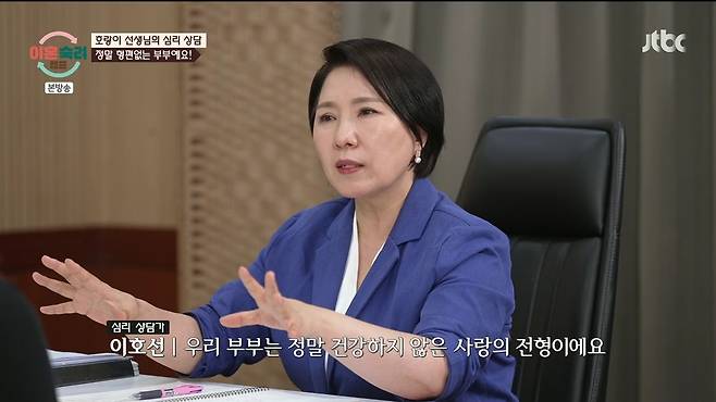 분노 부부는 다음날 심리상담에 나섰다. 전문가인 이호선 상담가는 "이 부부는 건강하지 않은 사랑의 전형이다. 이상한 정도가 아니라 둘 다 굉장히 위험한 집"이라고 쓴소리를 날리며 "저는 이 부부가 싫다. 너무 걱정돼서다. 부부가 조정이 안 되면 그냥 헤어지시라"고 당부할 만큼 상황이 심각하다고 진단했다.