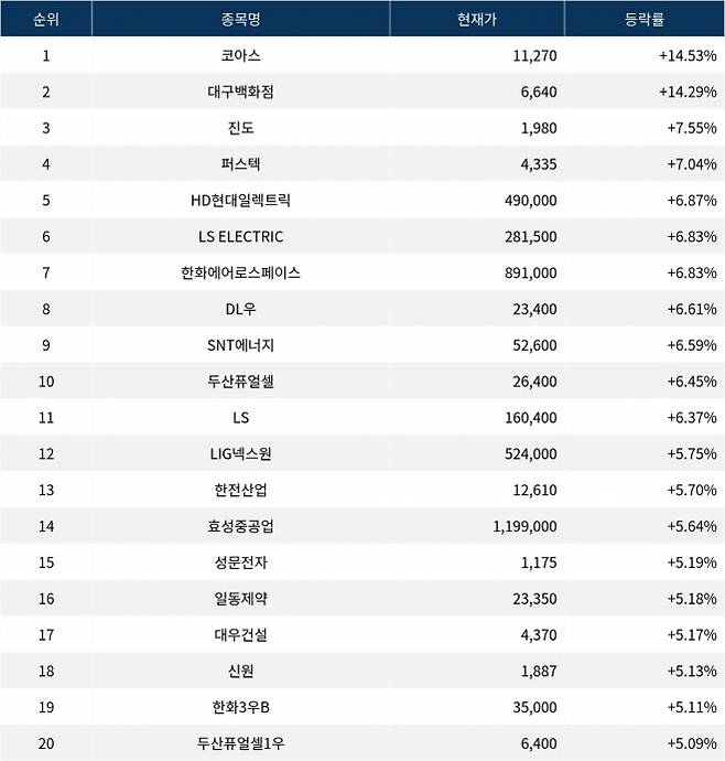 이어 상승률 2위 대구백화점(006370)은 주가가 14.29% 급등하며 종가 6,640원에 상승 마감했다. 상승률 3위 진도(088790)의 주가는 1,980원으로 7.55% 상승하며 부진을 면했다. 상승률 4위 퍼스텍(010820)은 7.04% 상승하며 4,335원에 마감했다. 상승률 5위 HD현대일렉트릭(267260)은 6.87%의 상승세를 타고 종가 490,000원에 마감했다.
