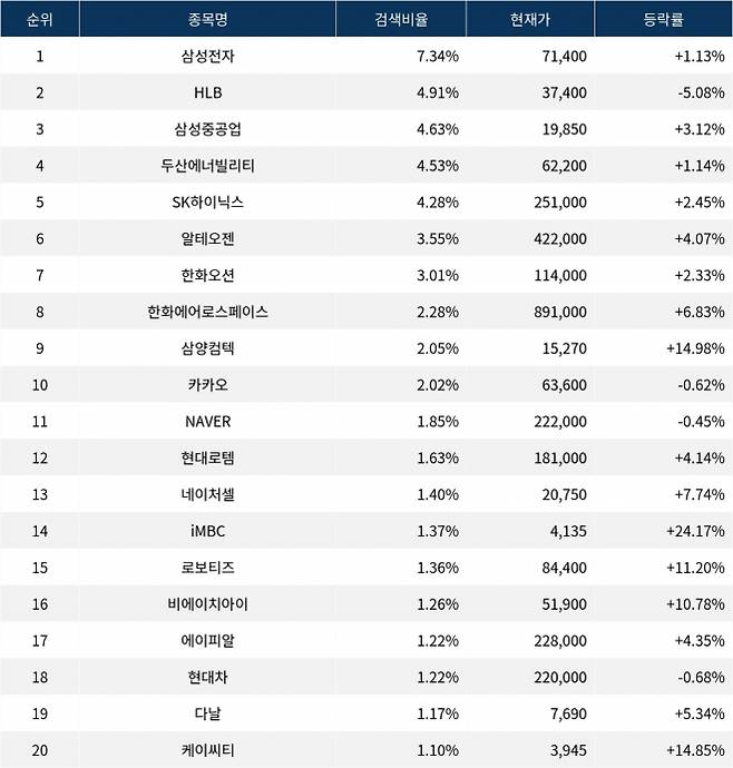 이어 검색비율 2위의 HLB(028300)는 하락률 5.08%로 하락 마감했다. 검색비율 3위의 삼성중공업(010140)은 3.12% 상승 마감했다. 검색비율 4위 두산에너빌리티(034020)는 상승률 1.14%를 기록했다. 검색비율 5위 SK하이닉스(000660)는 2.45% 상승하며 마감했다.