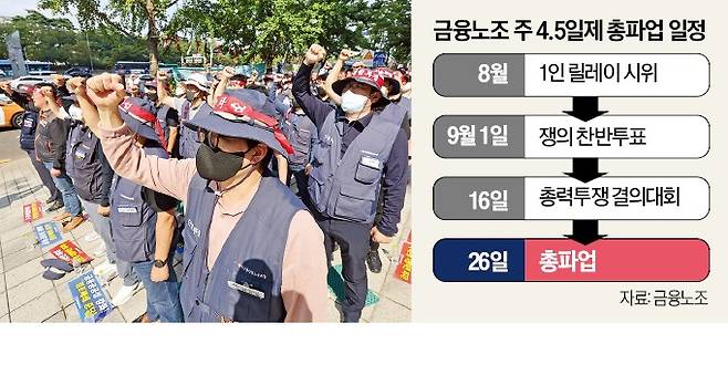 전국금융산업노동조합이 다음달 주 4.5일제 도입을 목표로 총파업에 들어갈 전망이다.