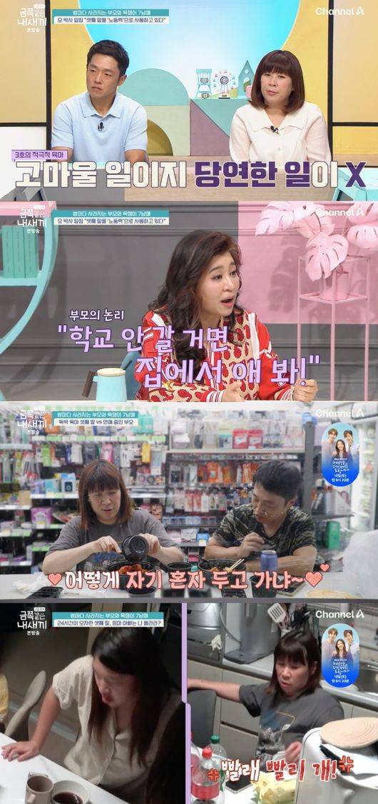 한편, 단둘이만 집 밖으로 나서는 엄마, 아빠는 엄마가 일하는 편의점으로 향했다. 아빠는 육아 대신 엄마를 돕기로 한 것. 심지어 아빠는 전화로 육아를 토로하는 셋째의 말에도 “힘내”라고 건성하게 답할 뿐이었다. 이에 장영란은 “어머님, 아버님 애기잖아요. 셋째 아기 아니잖아요”라고 말했다.