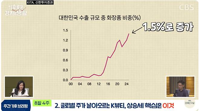 한동안 관세 협상 때문에 제조업, 중후장대 산업에 모든 관심이 쏠려 있었어요. 오늘은 소비재 얘기를 해보려고 합니다. 화장품 업계 얘기 가져왔는데요. K뷰티라는 말이 언젠가부터 익숙해졌어요. 해외에서 우리나라 화장품이 인기를 얻으면서 수출 산업으로 부상하고 있는데 작년에 우리나라 수출 규모 중에 화장품 비중이 1.5%로 올라섰습니다. 그래프를 보시면 2016년부터 정말 가파르게 급증해 온 걸 알 수 있어요.