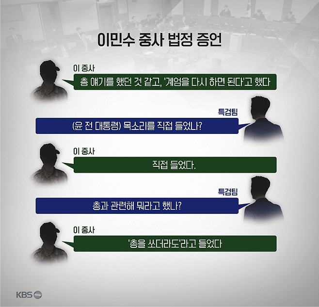 특검 측이 "총과 관련해 구체적으로 무슨 말을 했냐" 묻자 "기억이 맞다면 '총을 쏘더라도' 이런 말을 들었다"고 말했습니다.