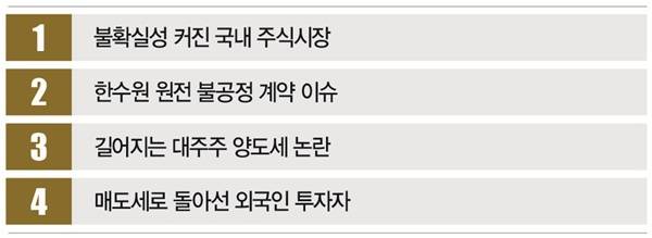 # 국내 증시가 상승세로 한주를 마감했지만 시장의 불안감은 여전하다. 길어지는 대주주 양도소득세 논란과 낮아진 미국의 금리인하 기대감, 인공지능(AI) 거품론 등이 시장을 흔들 악재로 작용할 공산이 커서다. 여기에 25일 열리는 한미 정상회담의 불확실성도 투자심리에 부정적인 영향을 미치고 있다. 거침없었던 국내 증시의 상승세에 제동이 걸리고 있다는 얘기다.