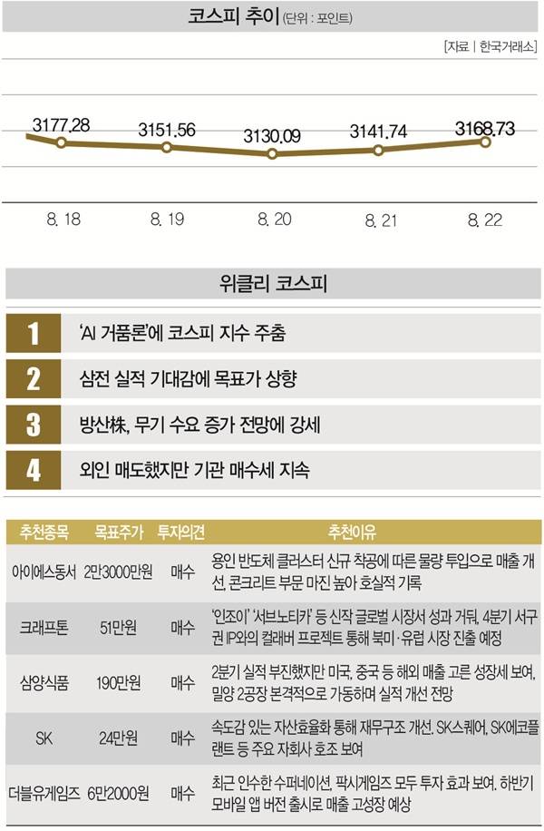 # 국내 증시의 불확실성이 높아지고 있다. 코스피지수는 18일 3200포인트대 아래로 떨어지며 3거래일 연속 하락했다. 다행히 21일과 22일 소폭의 오름세를 기록했다. 그 결과, 20일 3130.09포인트까지 떨어졌던 코스피지수는 22일 3168.73포인트로 상승했다.