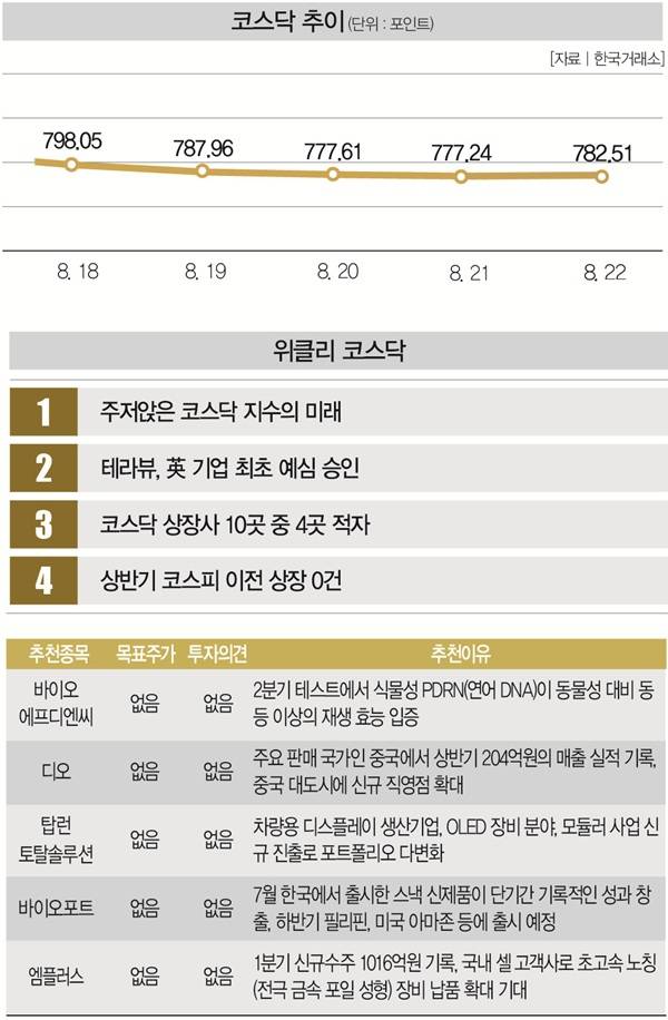 # 코스닥지수도 반등점을 찾았지만 아직은 안정적이지 않다. 18~21일 4거래일 연속 하락하며 777.24포인트까지 떨어졌던 코스닥지수는 22일엔 전 거래일 대비 0.68% 오른 782.51포인트로 장을 마쳤다.