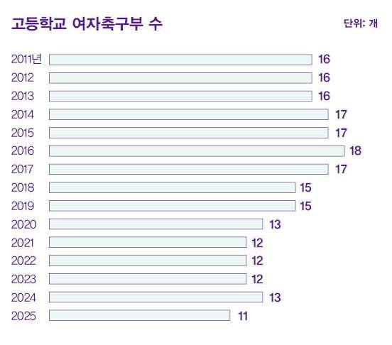 이런 일방적 경기 장면은 한국 여자축구 대회 초등, 중등, 고등부 경기에서 매우 흔하다. 전국에 여자축구부가 있는 고등학교는 11곳, 클럽팀 1곳까지 하면 여자아이들이 전문선수로서 축구를 할 수 있는 18살 이하 팀은 12곳에 불과하다. 2025년 현재 남자축구부가 있는 고등학교는 99곳, 클럽은 100곳이다. 등록한 전문선수로 따지면 여학생은 282명, 남학생은 6728명으로 23배가량 차이가 난다.