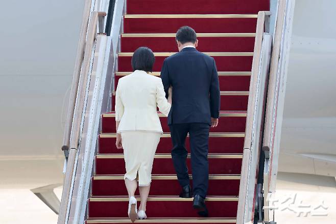 이재명 대통령과 부인 김혜경 여사가 23일 한일·한미 정상회담을 위해 경기도 성남 서울공항을 통해 출국하고 있다.