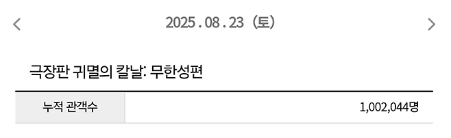 영진위 영화관입장권 통합전산망에 따르면, '극장판 귀멸의 칼날: 무한성편'(이하 '귀멸의 칼날')은 23일 오후 1시 55분경 관객 100만 명을 넘겼다.