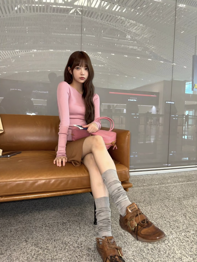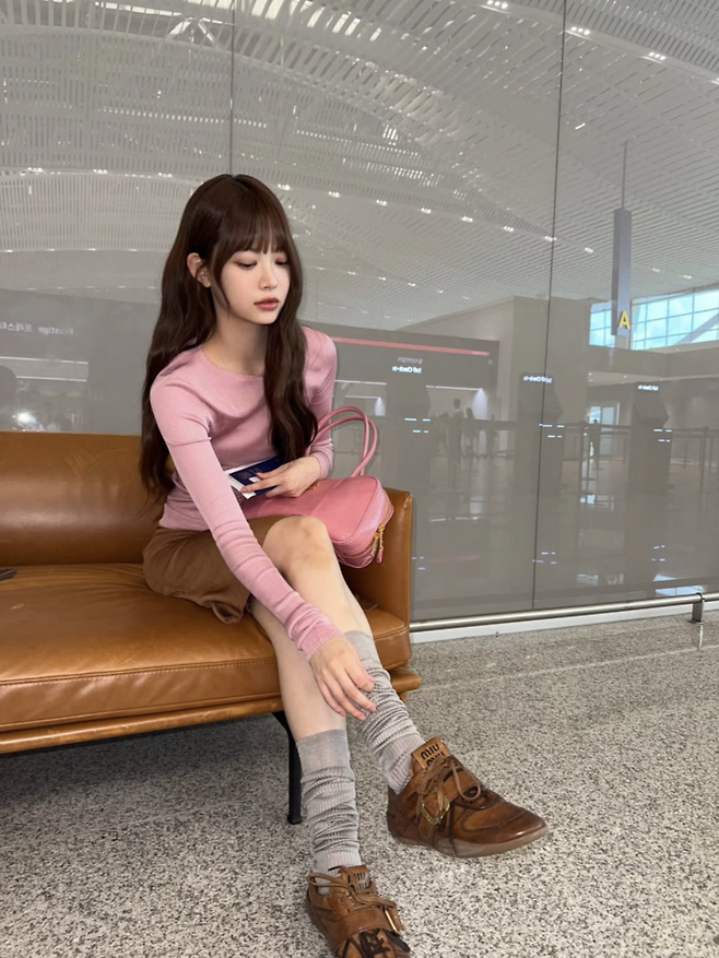 특히 눈길을 끈 아이템은 레더 로퍼와 니트 삭스. 클래식한 브라운 톤의 슈즈에 브랜드 로고가 박힌 두꺼운 삭스를 더해 트렌디하면서도 편안한 공항 패션을 완성했다. 이와 함께 손에 든 핑크 컬러의 뱀피 텍스처 토트백 역시 고급스럽고 생기 있는 포인트 아이템으로 작용했다.