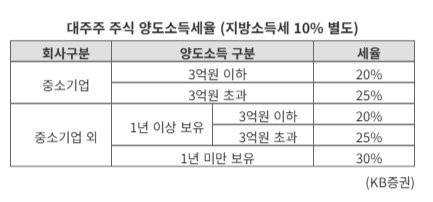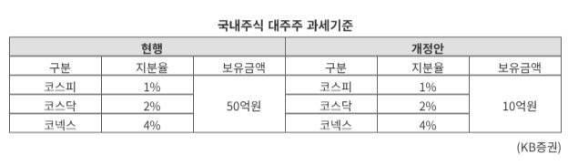 24일 KB증권에 따르면 현재 본인 기준 국내주식 보유금액이 50억원을 넘거나, 코스피 상장기업의 지분을 1% 넘게 갖고 있다면(코스닥은 2%, 코넥스는 4%) 대주주로 분류된다.
