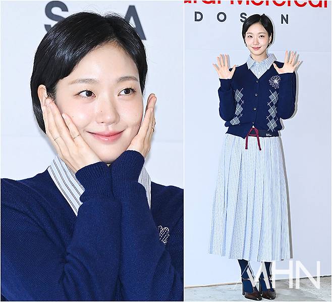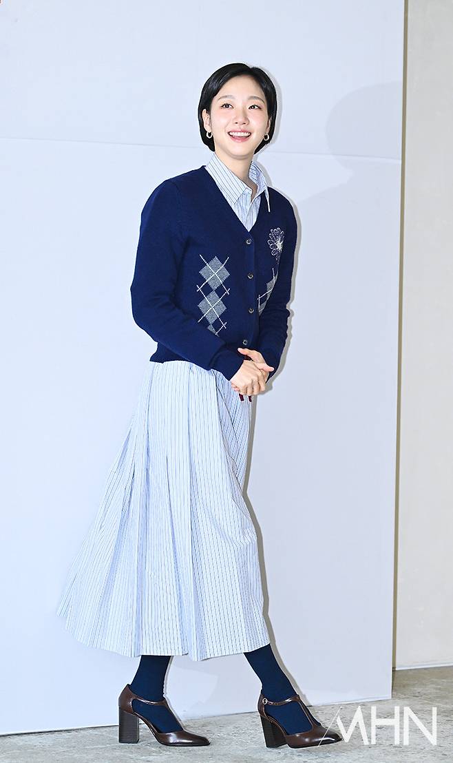 이날 김고은은 블루 스트라이프 셔츠와 롱 플리츠 스커트로 클래식하면서도 청초한 가을 룩을 선보였다.