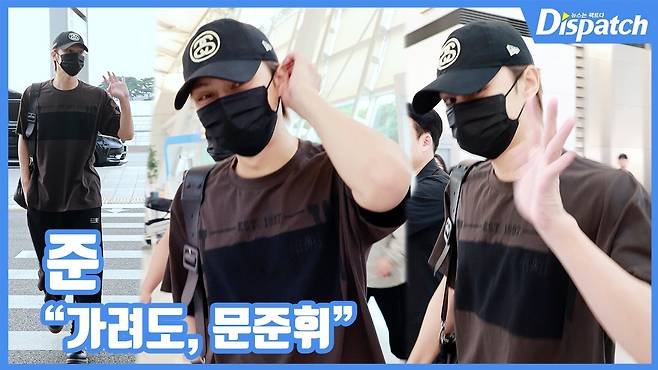 이날 준은 캡 모자와 마스크 사이로 보이는 짙은 눈매만으로도 잘생긴 비주얼을 뽐냈다.