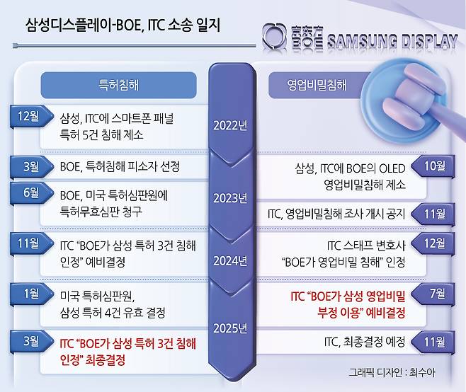 미국 국제무역위원회(ITC)는 지난 7월 예비결정을 통해 중국 BOE 및 7개 자회사가 삼성디스플레이의 OLED 영업비밀을 침해했다고 인정하면서 14년 8개월 동안 BOE의 OLED 패널을 미국으로 수입하지 못하도록 했다.