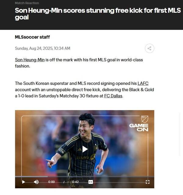 MLS, 대서특필! '최고! 최고! 최고!' 손흥민, MOM 싹쓸이..."SON, 월드클래스 수준의 데뷔 골, 막을 수 없는 다이렉트 프리킥"