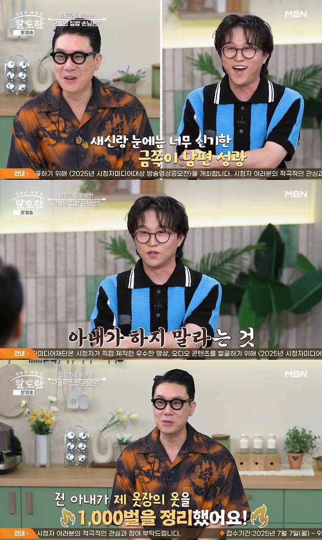 이상민은 박성광에게 "가장 자신 있는 나만의 재능이 있나"라며 궁금해했고, 박성광은 "아내가 하지 말라는 걸 제일 잘한다"라고 말해 웃음을 안겼다. 이상민은 "어떻게 살아 남았지?"라고 고개를 갸우뚱한 후 "저는 아내가 제 옷장의 옷을 1000벌 정리했다"라고 사랑꾼 면모를 드러내 놀라움을 안겼다. 박성광은 "그거 쉽지 않은데. 사랑이 무섭다"라며 당황했다.