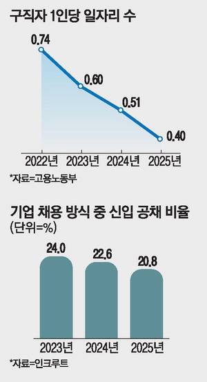 고용노동부에 따르면 구직자 1명당 일자리 수를 뜻하는 '구인배수'는 지난달 0.40으로, 2022년(0.74) 이후 3년 만에 절반 수준으로 감소했다. 대졸 이상이 첫 취업을 하기까지 평균 소요 기간도 지난 5월 8.8개월로 2020년(7.2개월) 이후 5년 만에 두 달 가까이 늘었다.
