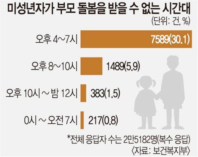 보건복지부가 24일 발표한 '오후 8시 이후 연장돌봄 이용수요 설문조사'에 따르면, 0시부터 오전 7시까지 아이가 보호자 돌봄을 받지 못한다고 답한 부모는 응답자의 0.8%(217명)였다.